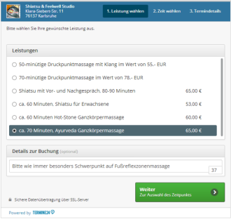 Im ersten Schritt wählen Sie die gewünschte Leistung aus. Wenn Sei einen Gutschein einlösen möchten, geben Sie bitte den Gutschein zugehörig zu der Leistung ein und klicken danach auf
